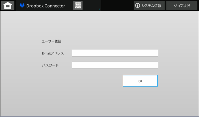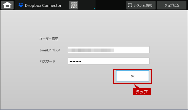 2. Dropbox Connectorに接続すると、ユーザー認証画面が表示されますので、E-mailアドレスとパスワードを入力して[OK]をタップします。