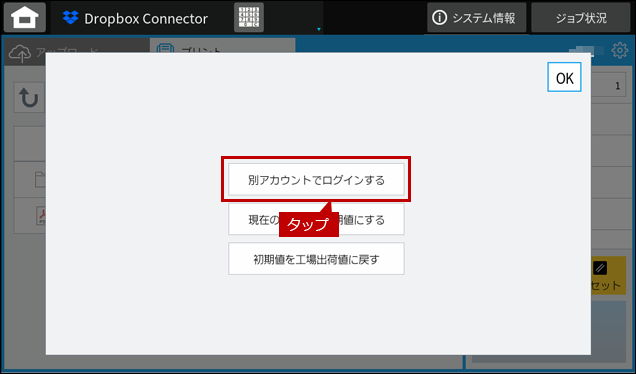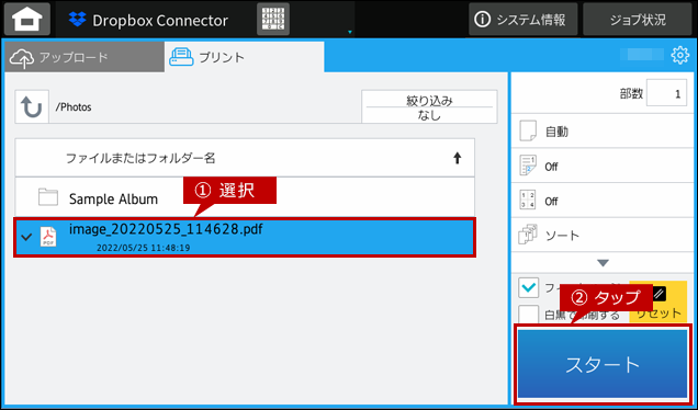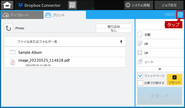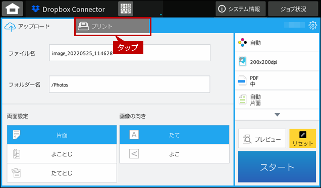 1. Dropbox Connectorの操作画面で、[プリント]タブをタップします。