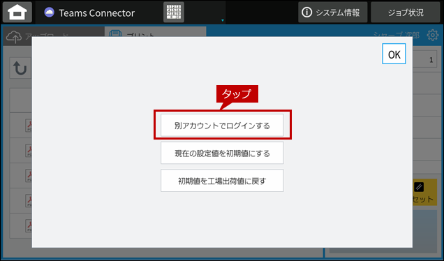 3.「別のアカウントでログインする場合は[OK]を押してください。」のダイアログ画面が表示されますので[OK]をタップします。