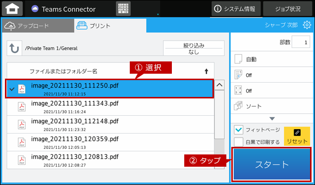 2. ファイルまたはフォルダー名の一覧から印刷するファイルを選択して、[スタート]をタップします。
