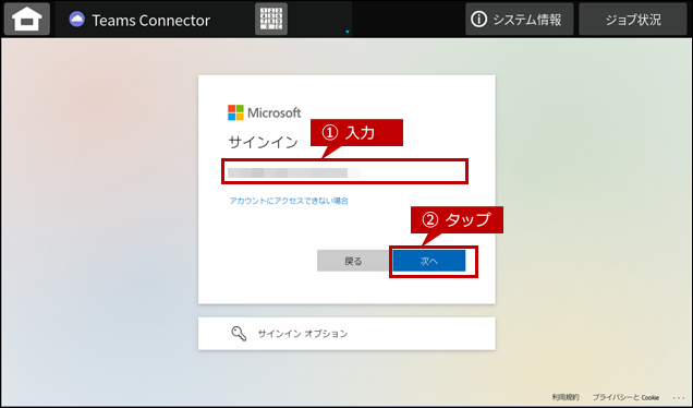 | ・複合機のユーザー認証機能が有効な場合、1回目はログイン操作が必要になりますが、2回目以降のログイン操作は不要になります。(複合機のログインユーザーごとにMicrosoftアカウントの情報が紐付けされます。) |