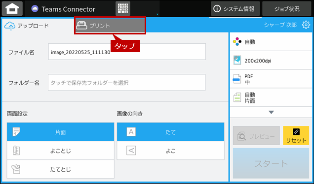 1.Teams Connectorの操作画面で、[プリント]タブをタップします。