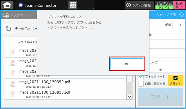 3. 「プリントを予約しました。~」のダイアログ画面が表示されますので[OK]をタップします。