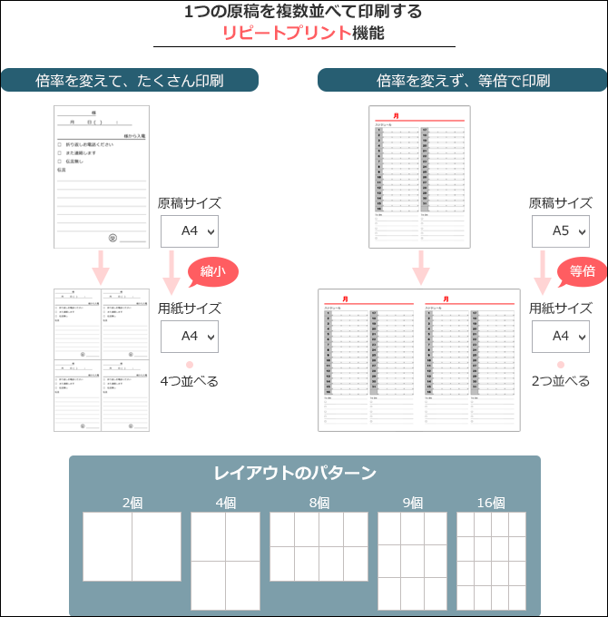 1つの原稿を複数並べて印刷する「リピートプリント」機能をご利用ください。