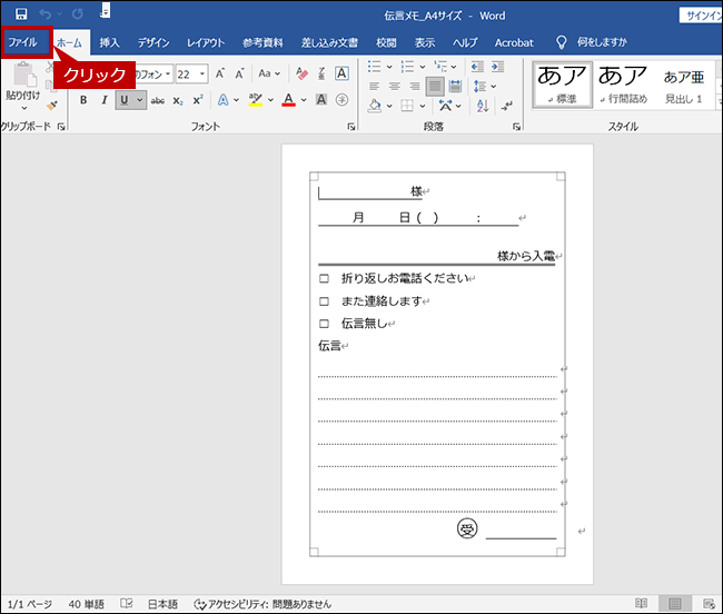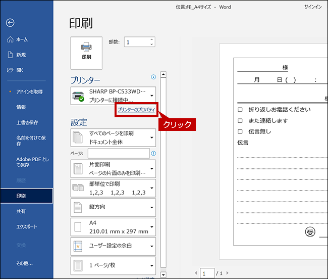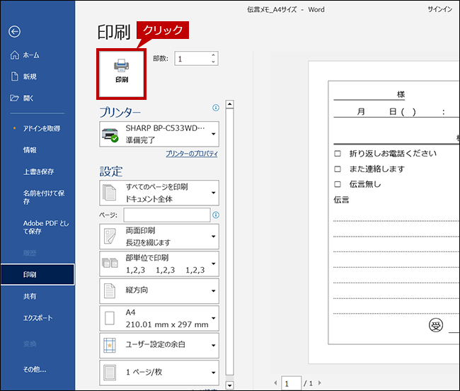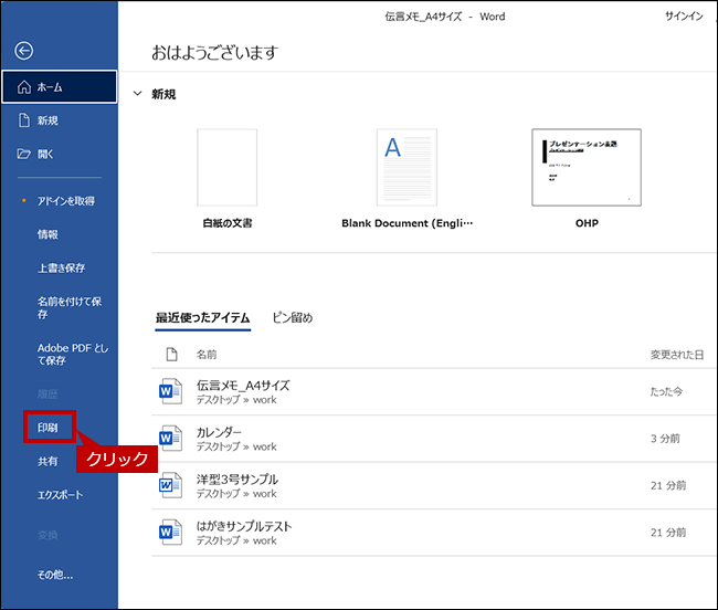本ページでは、Microsoft365で開いている文書を印刷する例でご説明します。