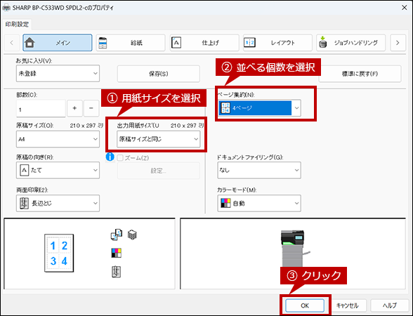 設定例)A4原稿1ページを、A4用紙に4つ並べて印刷する