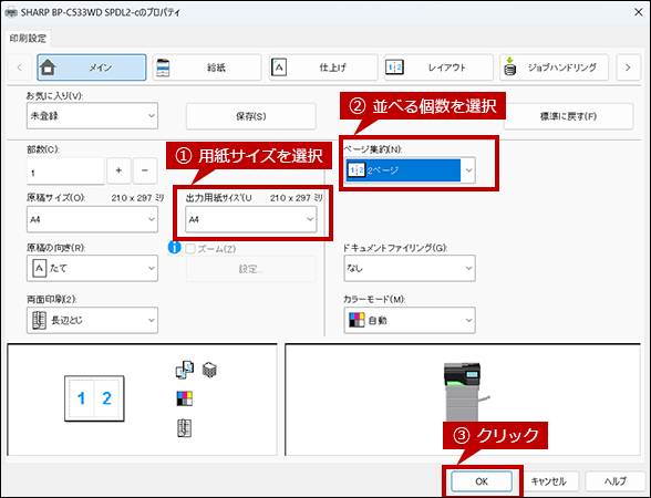 - ※ 倍率を変えたくない場合、原稿を指定した数だけ並べるには、どの用紙サイズを選択すれば良いのかをあらかじめ把握しておいてください。