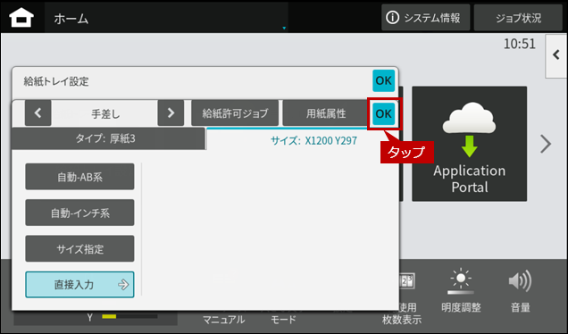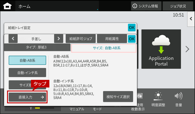4.「サイズ(自動AB系)」タブを選択して、「直接入力」をタップします。