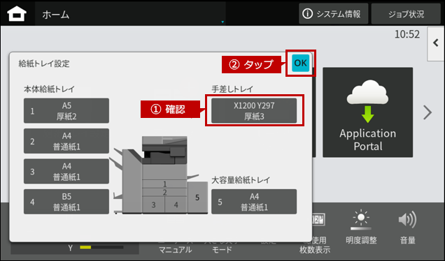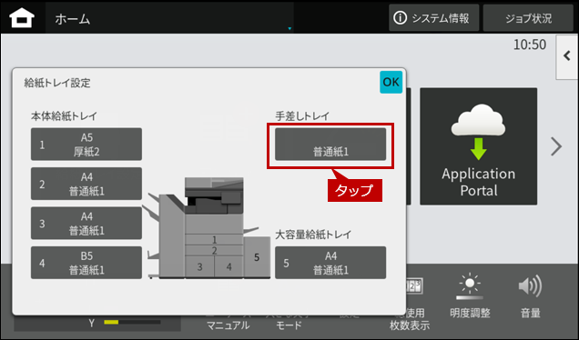 1. ホーム画面の[給紙トレイ設定]をタップします。