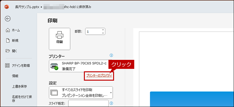 4.「印刷」画面が表示されますので、[プリンターのプロパティ]をクリックします。