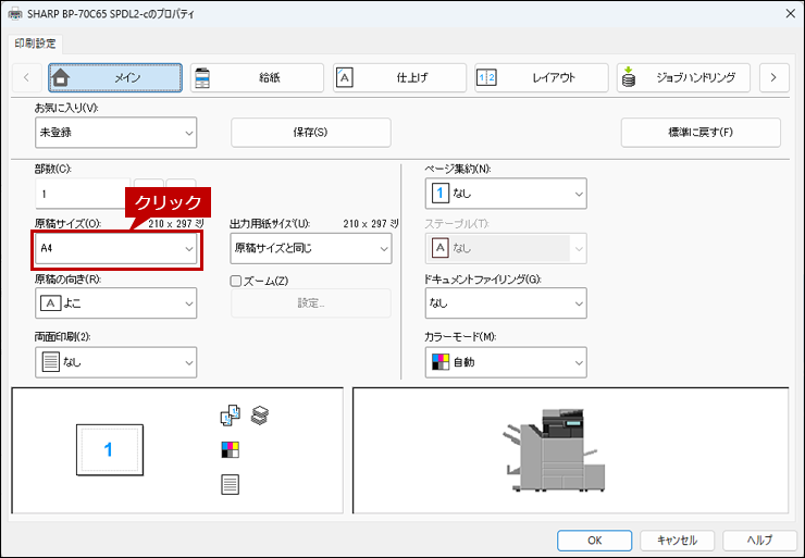 8.「印刷設定」画面に戻りますので、[原稿サイズ(O)]を確認して、[給紙]タブをクリックします。