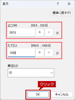 7.「長尺」画面が表示されますので、[よこ(W)]と[たて(L)]のサイズを入力して、[OK]をクリックします。