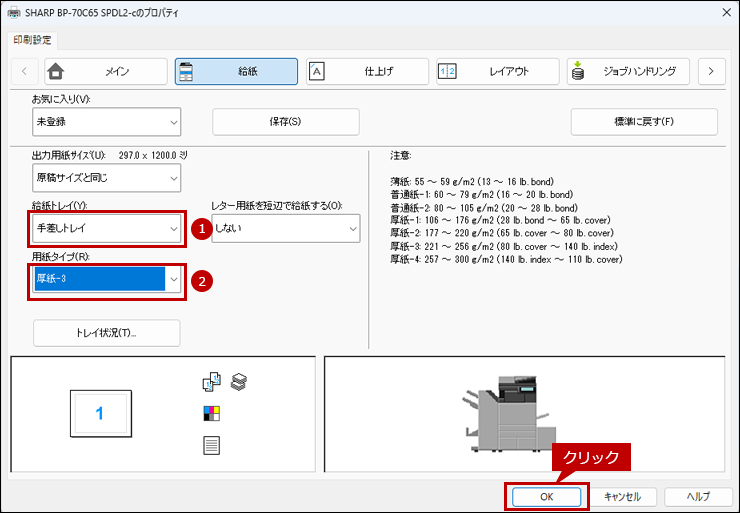 これで、セットした長尺用紙が手差しトレイから給紙されるように設定できました。