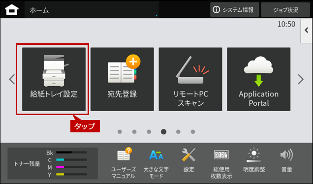 ※[給紙トレイ設定]ボタンがトップページにない場合は、ホーム画面を右にスクロールしてください。
