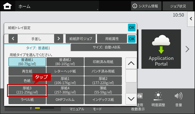 2.「給紙トレイ設定」画面が表示されますので、手差しトレイをタップします。