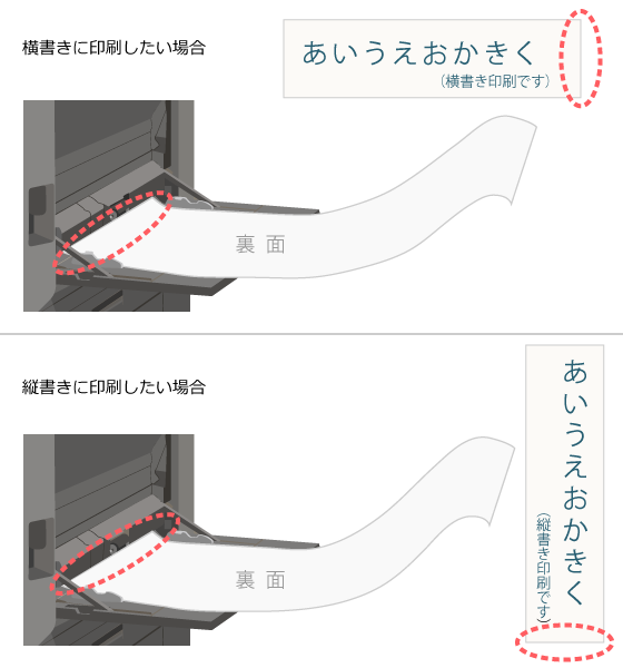 | 表裏の向き:印刷面を下にする 上下の向き:横書きの場合、用紙の右側を給紙口にセットする 縦書きの場合、用紙の下部を給紙口にセットする | |