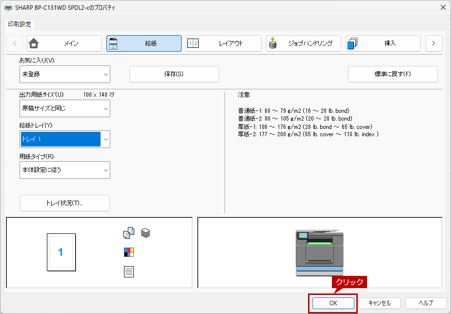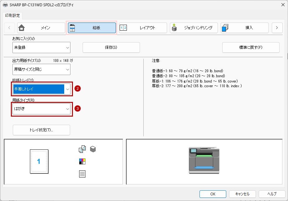 13. 次にプリンタードライバー設定画面で[給紙]タブをクリックし、給紙トレイと用紙タイプを設定します。