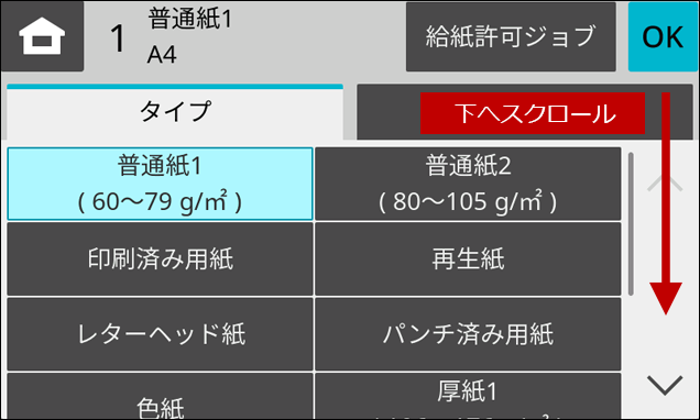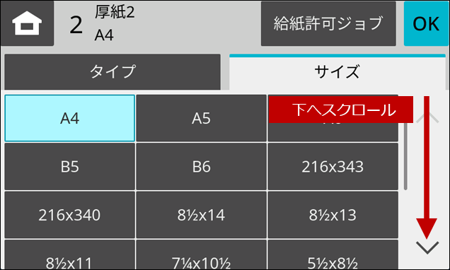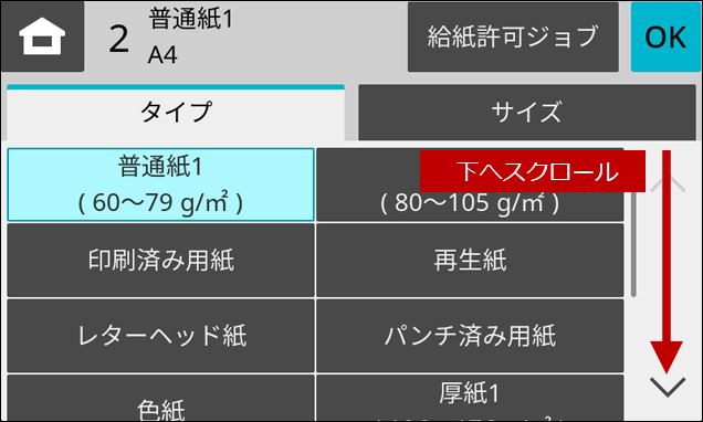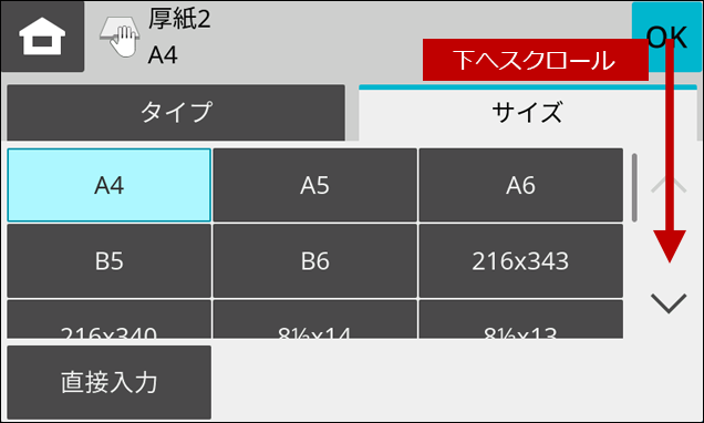 4.「用紙タイプ」の画面が表示されますので、画面をスクロールします。