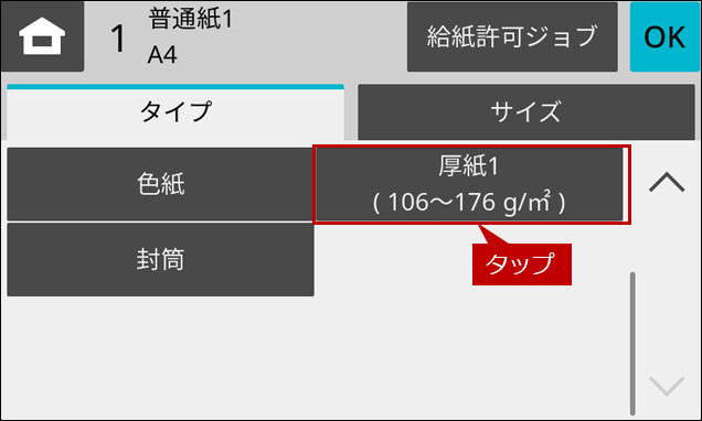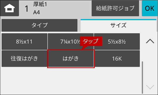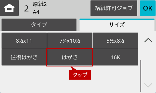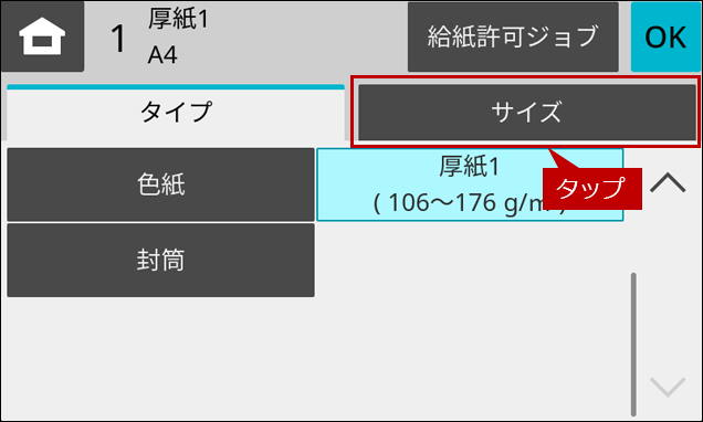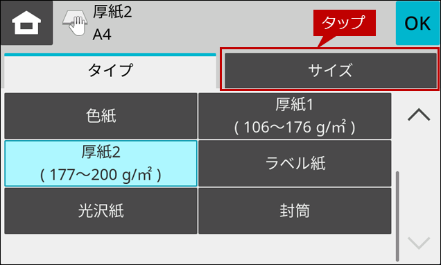 ※ [給紙トレイ設定]ボタンがトップページにない場合は、ホーム画面を右にスクロールします。