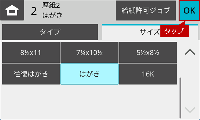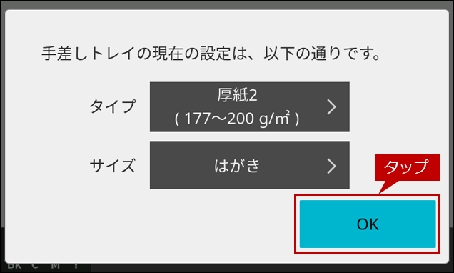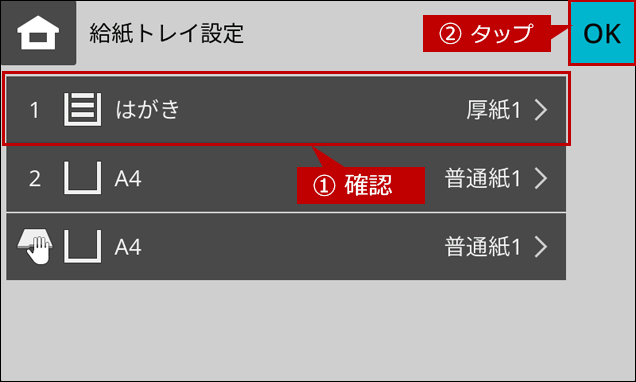 10. 給紙トレイ設定画面に戻りますので、設定した内容を確認して、[OK]をタップします。
