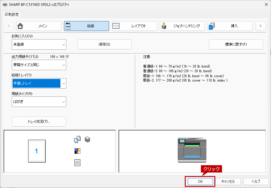 | トレイ1 | 厚紙1 | はがき | 本体設定に従う | はがき |