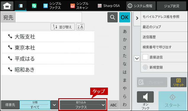 2. アドレス帳が表示されますので、[絞り込み]をタップします。