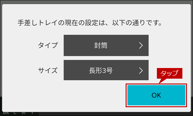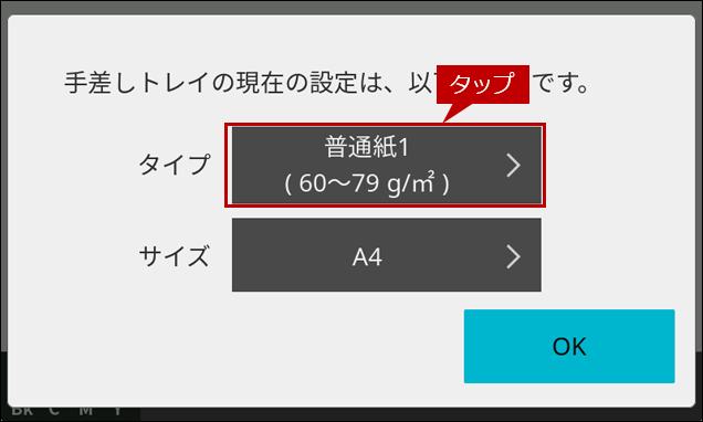 7.「手差しトレイ」の設定画面にもどりますので、[OK]をタップします。