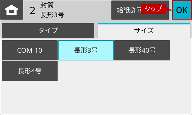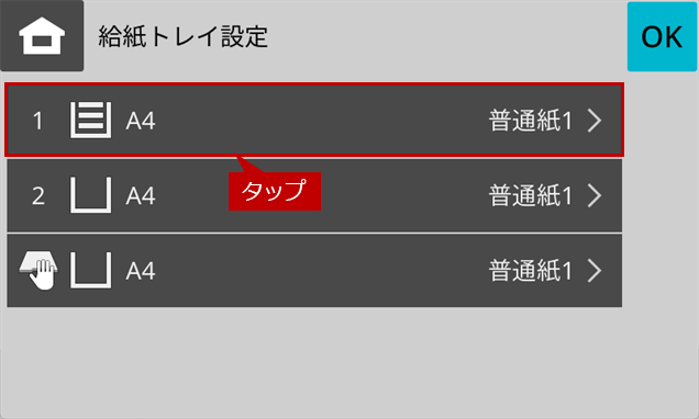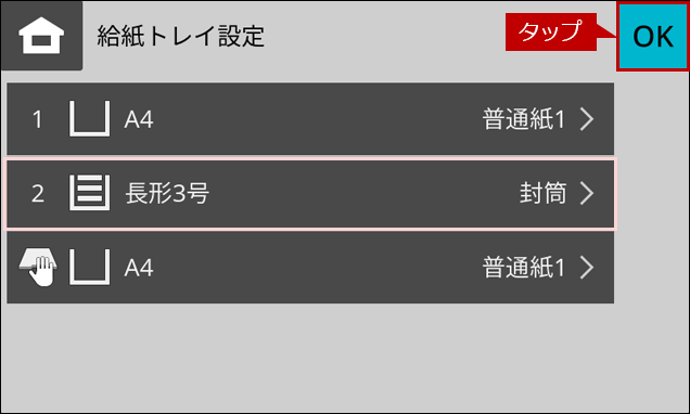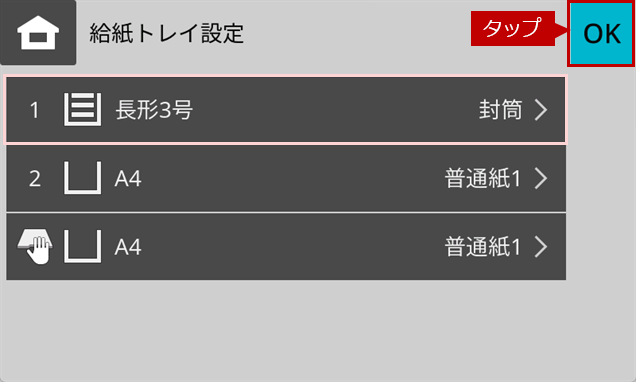 7.「給紙トレイ設定」画面にもどりますので、[OK]をタップします。