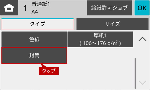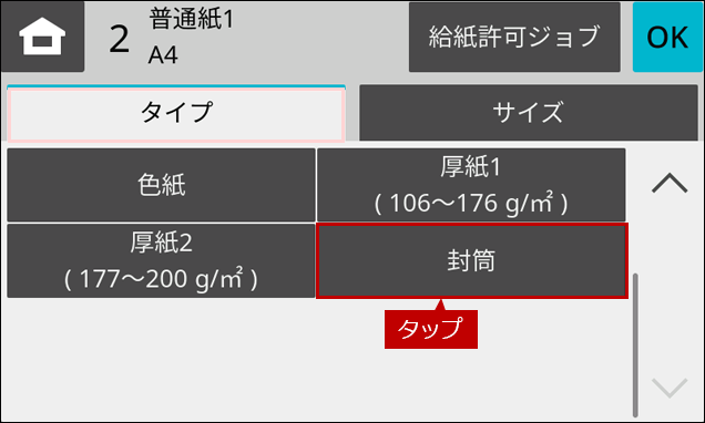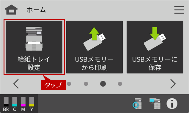 ※ [給紙トレイ設定]ボタンがトップページにない場合は、ホーム画面を右にスクロールします。