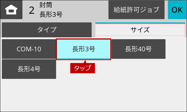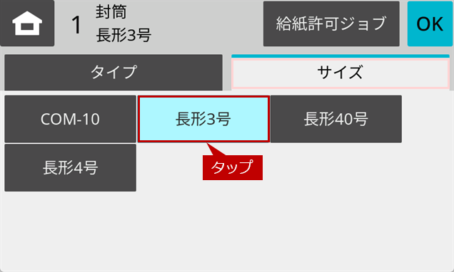 5.「サイズ」設定画面が表示されますので、セットした封筒のサイズを選択します。