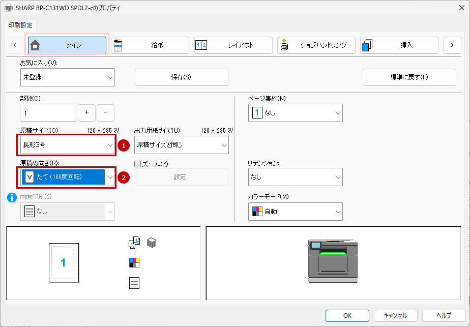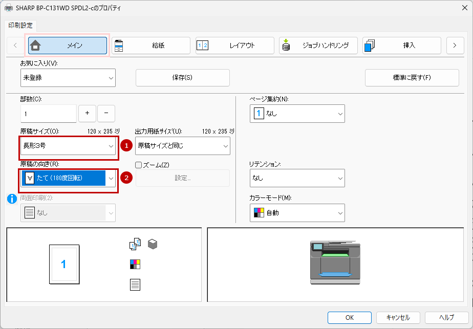 9.「プリンタードライバー」の設定画面で[メイン]タブを選択して、「原稿サイズ(O)」と「原稿の向き(R)」を設定します。