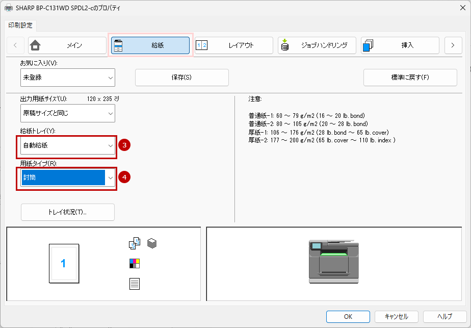 10. 次に、[給紙]タブをクリックし、「給紙トレイ(Y)」と「用紙タイプ(R)」を設定します。