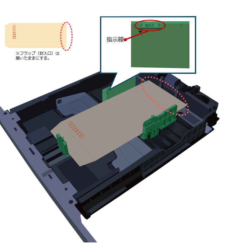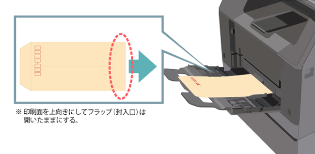 | 表裏の向き:印刷面を上にする 上下の向き:封筒の下部が右側(外側)になるようセットする ※ 封筒のフラップ(封入口)は開いたままにしておく 最大セット枚数:50枚以内で、指示線の高さまで | |
