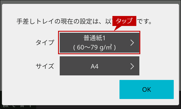 7.「手差しトレイ」の自動検知画面に戻りますので[OK]をタップします。