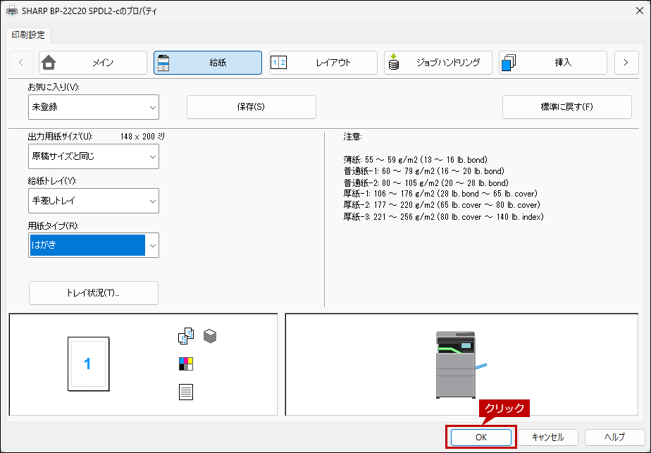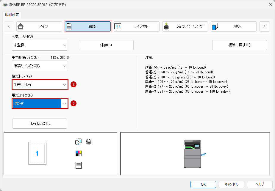 10. 次にプリンタードライバー設定画面で[給紙]タブをクリックし、給紙トレイと用紙タイプを設定します。