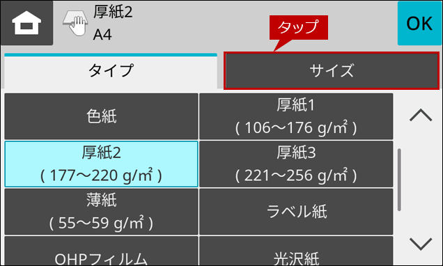 3.「用紙タイプ」の画面が表示されますので、画面を下へスクロールして、[厚紙2]をタップします。