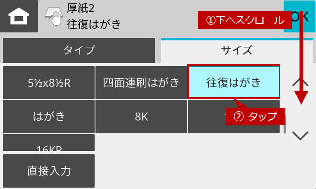 5. 「用紙サイズ」の画面が表示されますので、画面を下へスクロールして、[往復はがき]をタップします。