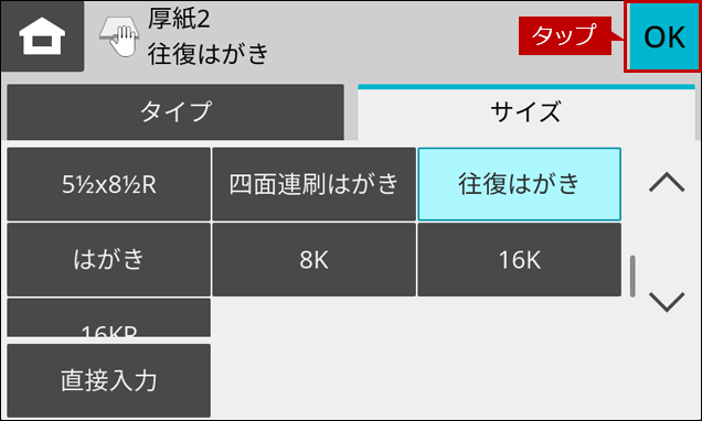 往復はがきに印刷するには、「手差しトレイ設定」画面で用紙タイプを「厚紙2」、用紙サイズを「往復はがき」に設定します。