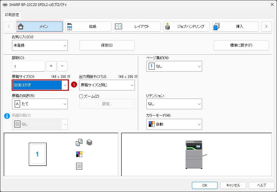 9.「プリンタードライバー」の設定画面で[メイン]タブを選択して、原稿サイズ(O)を「往復はがき」に設定します。
