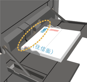 | 表裏の向き:印刷面を下にする 上下の向き:印刷面ではない面の宛名側が、給紙フィーダーに当たるようセットする 最大セット枚数:20枚まで | |