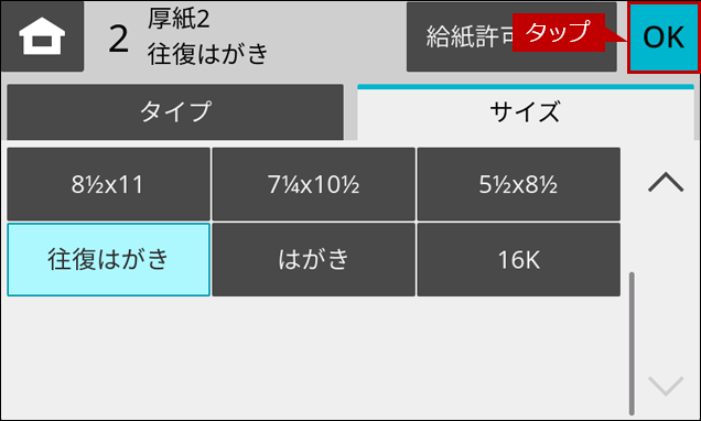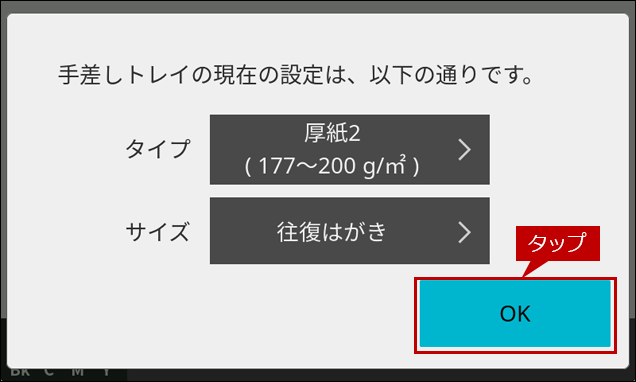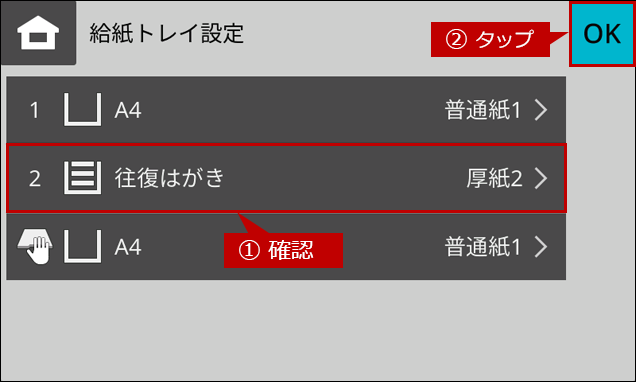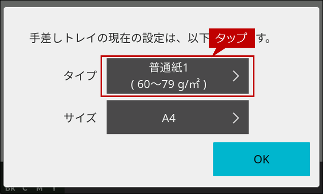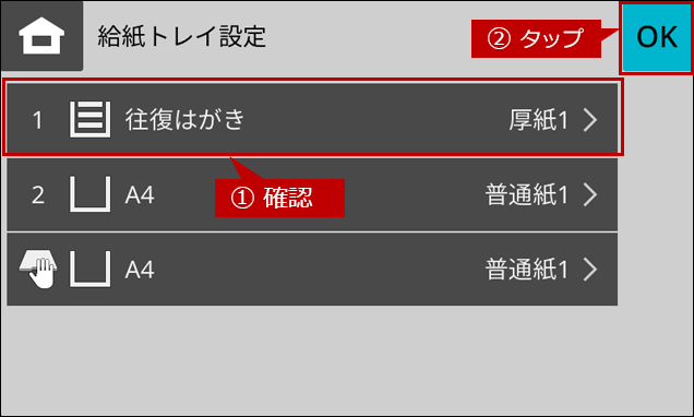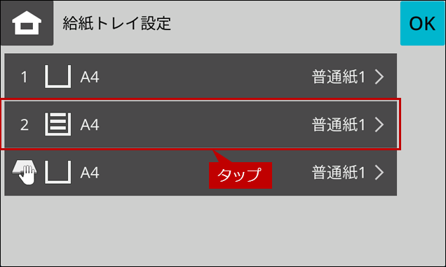 10. 給紙トレイ設定画面に戻りますので、設定した内容を確認して、[OK]をタップします。