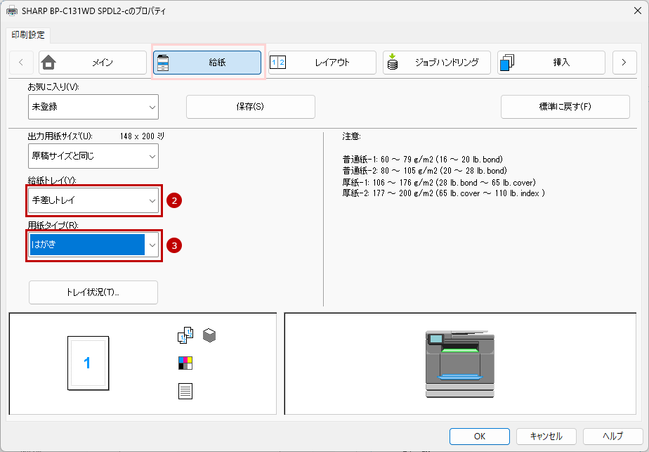 13. 次にプリンタードライバー設定画面で[給紙]タブをクリックし、給紙トレイと用紙タイプを設定します。