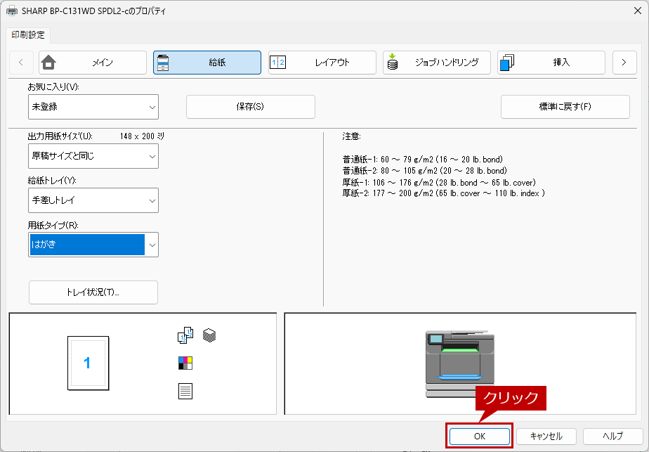 14. プリンタードライバー設定画面で[OK]をクリックして、印刷を実行します。