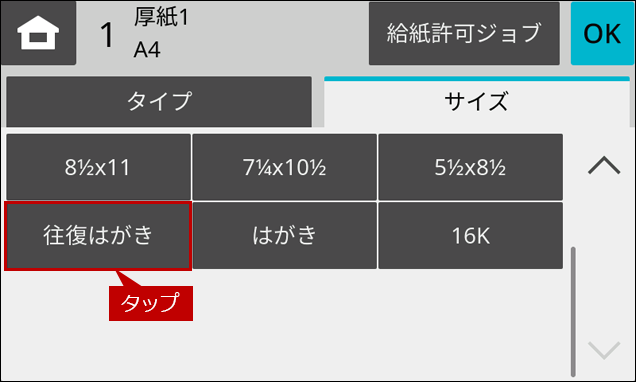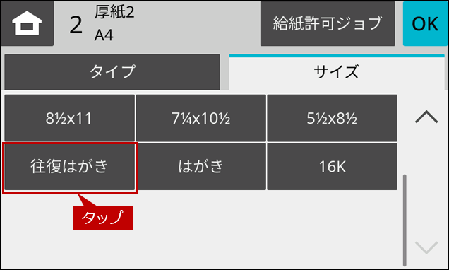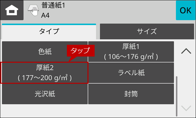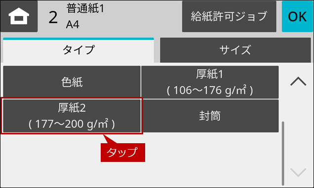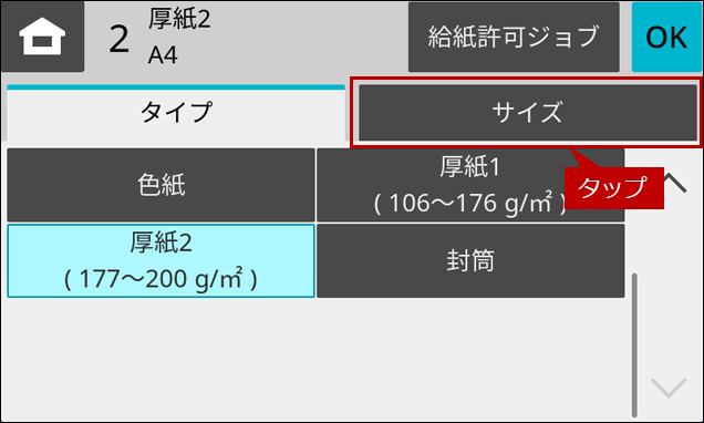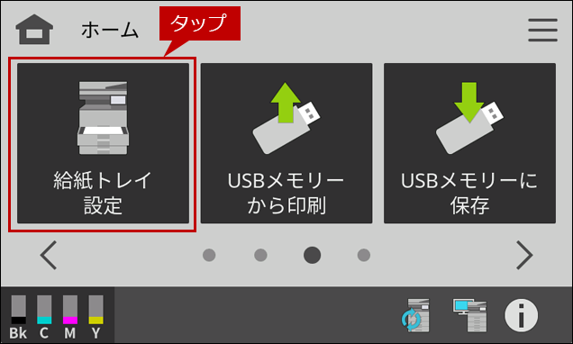 ※ [給紙トレイ設定]ボタンがトップページにない場合は、ホーム画面を右にスクロールします。