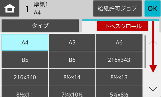 4.「用紙タイプ」の画面が表示されますので、画面をスクロールします。