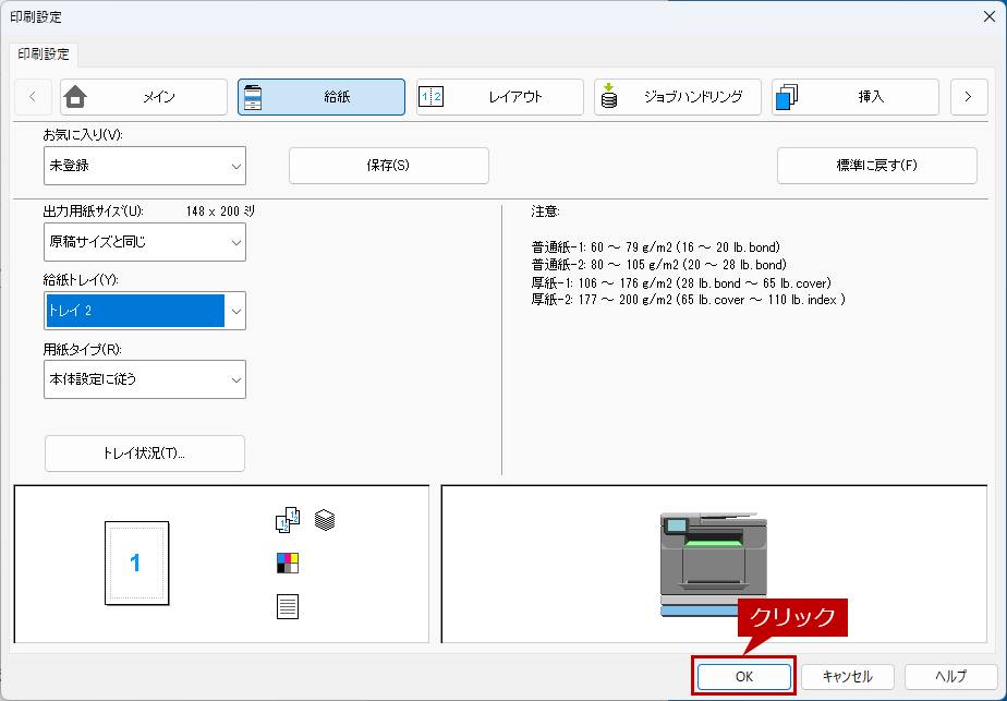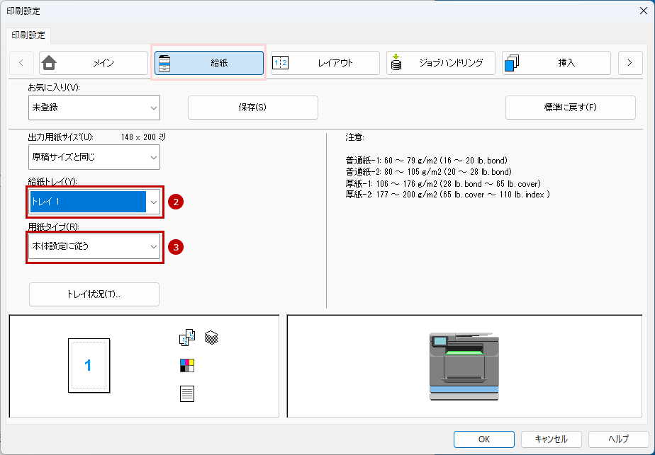 12. 次にプリンタードライバー設定画面で[給紙]タブをクリックし、給紙トレイと用紙タイプを設定します。