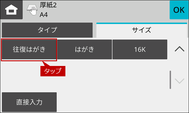 往復はがきに印刷するには、「給紙トレイ設定」画面で用紙タイプを「厚紙2」あるいは「厚紙1」、用紙サイズを「往復はがき」に設定します。
