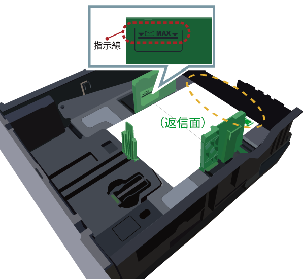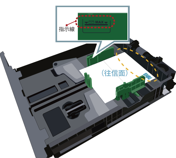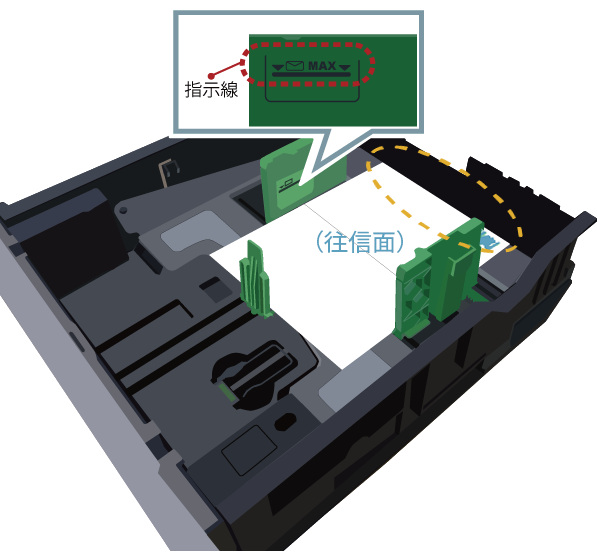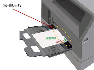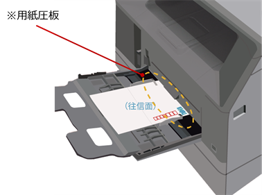 表裏の向き:印刷面を上にする 上下の向き:はがきの上部が給紙フィーダーに当たるようセットする ※用紙圧板をロックするまで押し下げて、用紙をそろえてからセットする 最大セット枚数:10枚まで | |