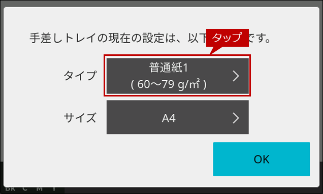8.「手差しトレイ」の自動検知画面に戻りますので、[OK]をタップします。