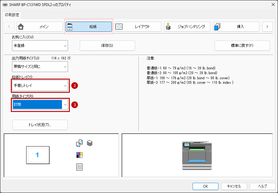 11. 次にプリンタードライバー設定画面で[給紙]タブをクリックし、給紙トレイと用紙タイプを設定します。